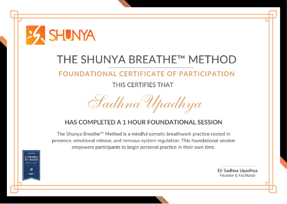 Dr. Sadhna Upadhya first learned the roots of what would later become the Shunya Breathe™ Method in 2017, while training for her yoga certification under her guru. At that time, she was introduced to a sequence of advanced techniques, carefully woven together to support overall well-being. She was encouraged to practice them regularly, and while she continued to explore them over the years, it wasn’t until after the global pandemic that these practices became a cornerstone of her life.